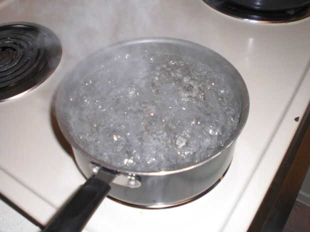 3. cuando el agua comienza a hervir, con cuidado vierta esta agua en tina-1. Seguir añadiendo agua hirviendo a Tina-1 hasta que tenga suficiente agua para cubrir completamente el tejido.