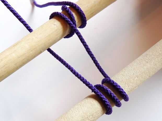 Mantener los cables base aparte y paralelo con los dedos. Llevar el hilo que teje en el alambre base (primer) opuesto y envuélvalo dos veces.