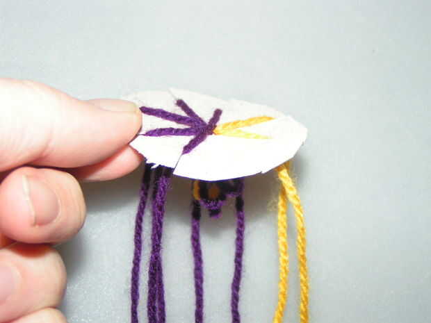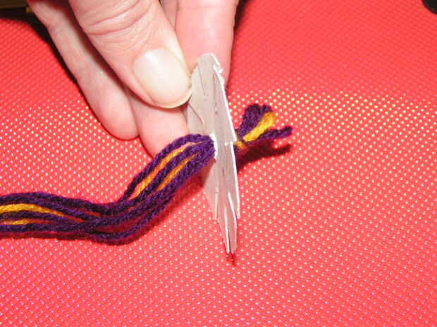 Los extremos sueltos del hilo de rosca a través del telar, tire el nudo hasta el agujero y extendió los hilos para que haya una pieza en todos sino una de las ranuras.