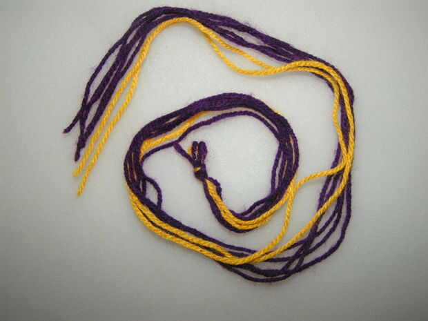 Los cables son más fáciles de utilizar con un lazo en un extremo, así que empieza con un pedazo de hilo todo el tiempo como necesidad * y tres piezas de hilo dos veces mientras. Los colores que utilizas son hasta usted.