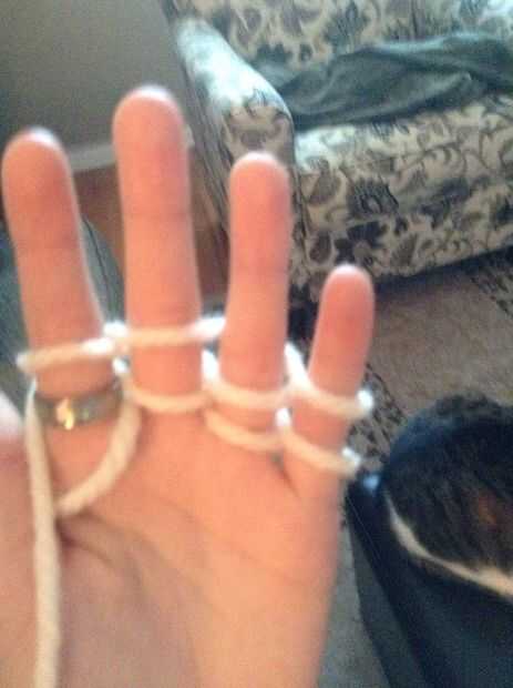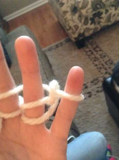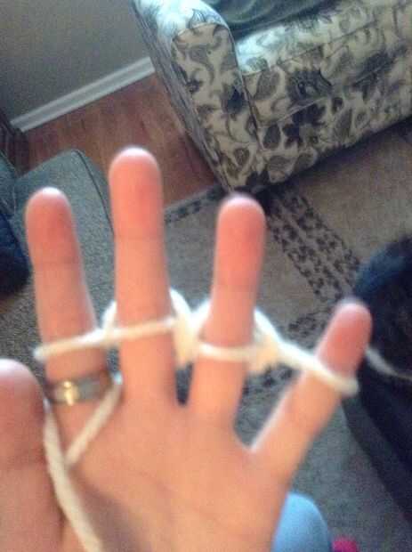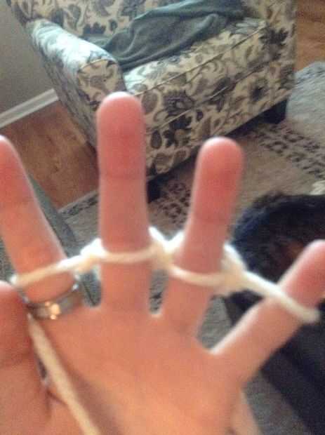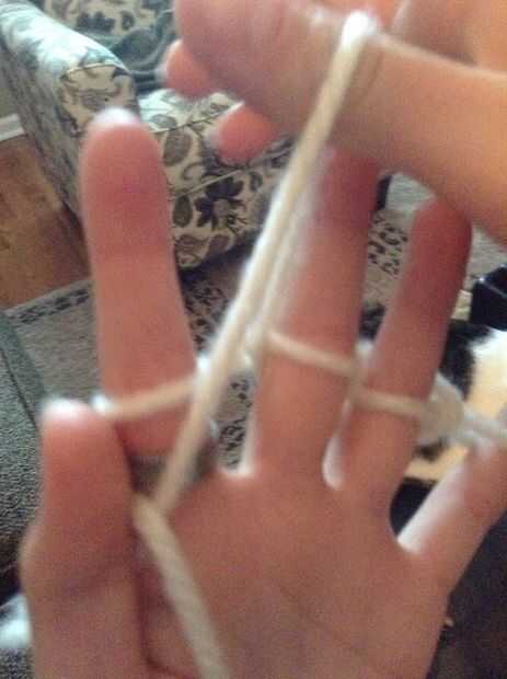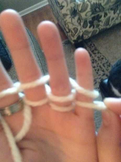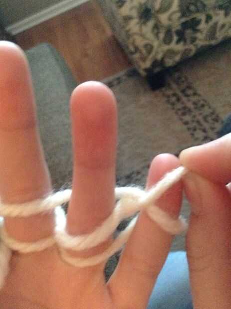 cómo hacer una manta fuera del solo hilado y sus dedos!Paso 1: Tejer dedos Para iniciar, sostener el hilado seleccionado en la mano con el pulgar como se muestra en la primera foto.Tejer el hilado, encima y por debajo, los otros 4 dedos como las sigu