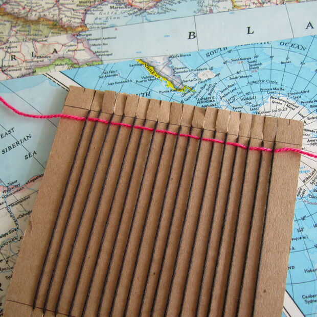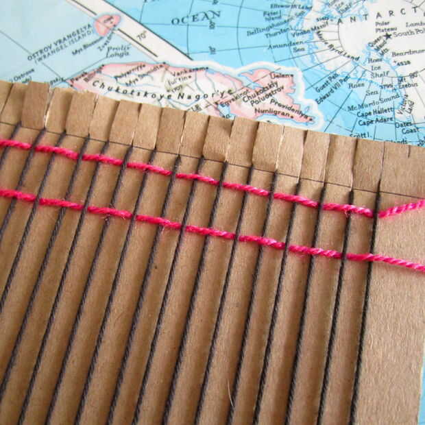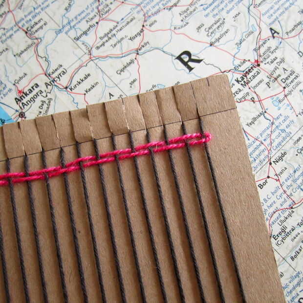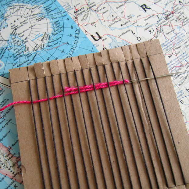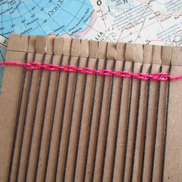 Que va a utilizar la aguja para guiar el hilo a través del telar en un patrón más bajo. (Bajo la primera cuerda, sobre el segundo, bajo el siguiente, etc.) Una vez que la aguja ha pasado por todas las cadenas, tire del hilo a través de y deja una cola de unas cuantas pulgadas en el extremo. Subir el hilo en el telar que es aproximadamente 1/4 pulgada de las ranuras.