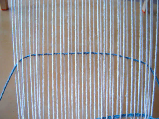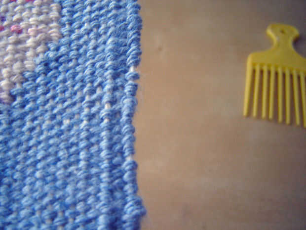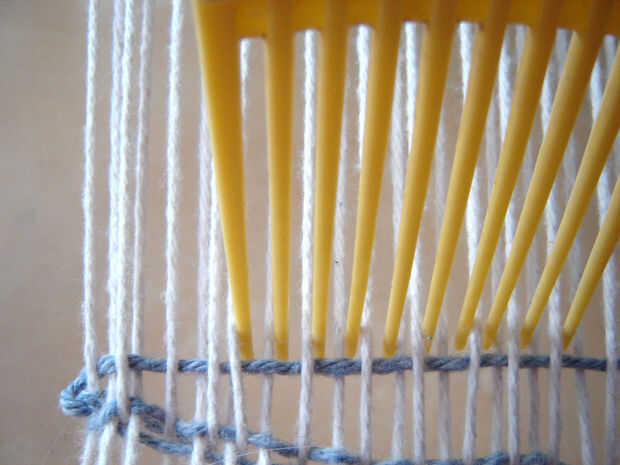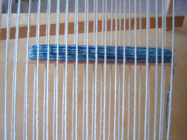 Atar el extremo del hilo para el primer subproceso de la deformación a la izquierda (no estoy seguro si se supone que haga esto, pero funcionó para mí). Levante el lizo y pasar la lanzadera de izquierda a derecha a través de la nave, deje el hilo de la trama libremente a través de la urdimbre. Deja ir el lizo y con el batidor baje los hilos de la trama hacia el final. Empuje hacia abajo el lizo y pasar la lanzadera de derecha a izquierda a través de la nueva nave. Otra vez el hilo debe sentarse libremente en la urdimbre y luego empuje hacia el final con el batidor. Continuar de esta manera.