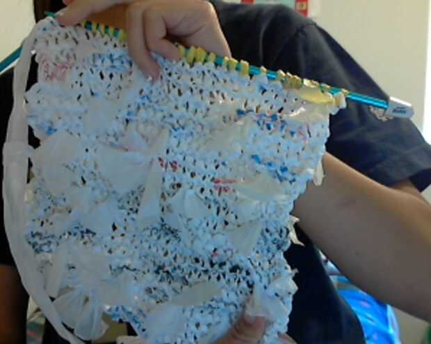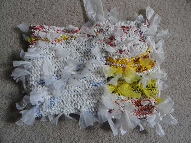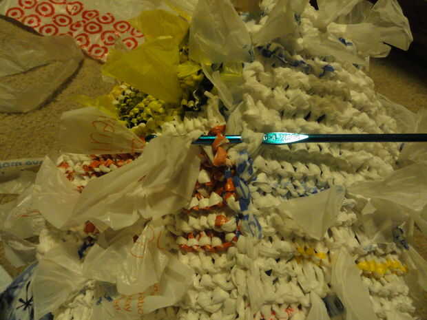 combina básicamente dos instructables de otros que he leído en el pasado. Una fue la creación de plástico "hilado" de bolsas de plástico. Supongo que aquí lo llaman "plarn" ahora. El otro fue trenzar cuerdas cuerda de filamentos más