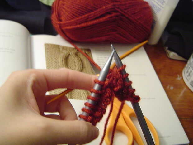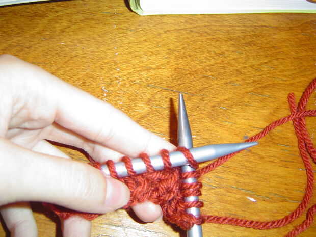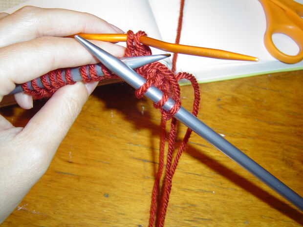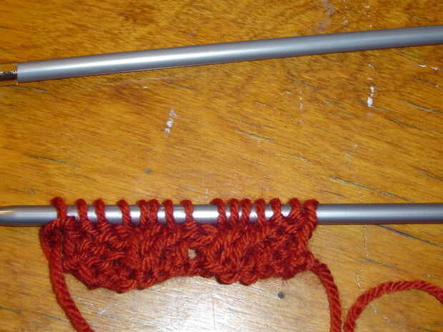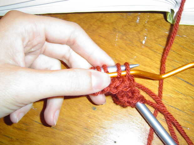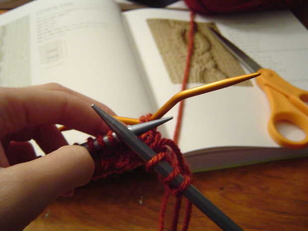 Me gusta hacer las puntadas en la aguja derecha un poco más para que no se salgan mientras trabaja con la aguja del cable. Deslice con cuidado los siguientes dos puntos en la aguja izquierda a la aguja del cable "purlwise". Que se ven al igual que en la aguja grande, en otras palabras. Sujete la aguja detrás de su trabajo con el medio y los dedos anulares en su mano izquierda.