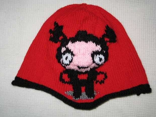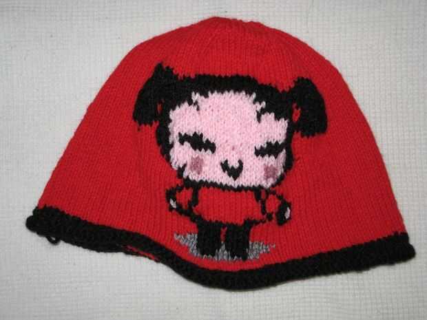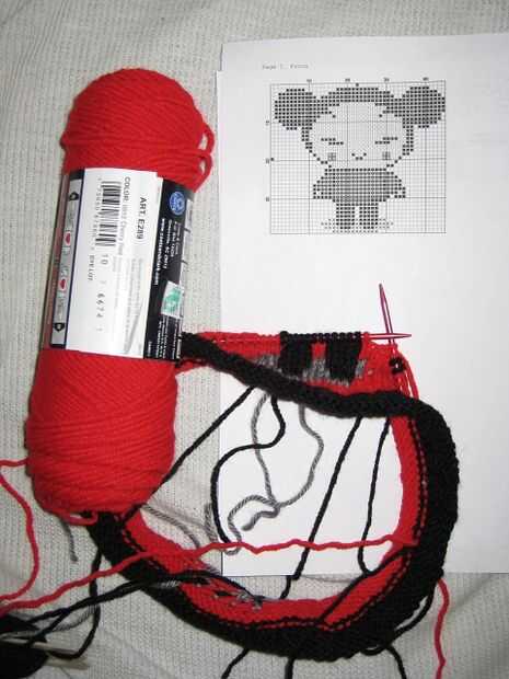 Ahora es momento de empezar a los patrones de intarsia. Hice arbitrariamente el Garu el frente y el patrón de Pucca la parte posteriora del patrón.