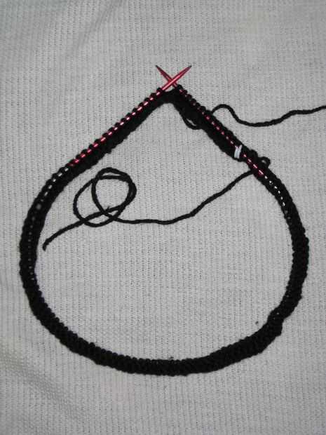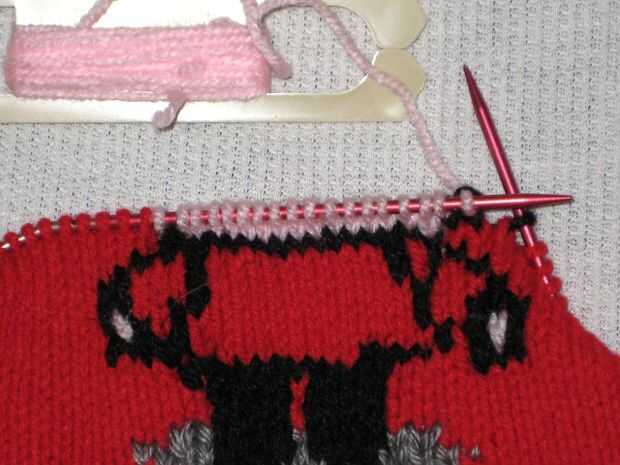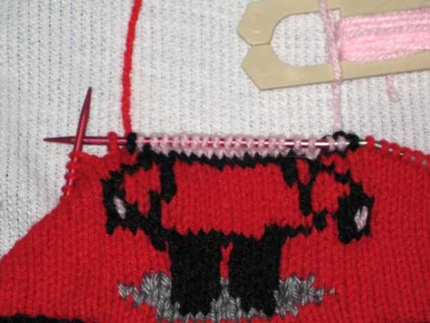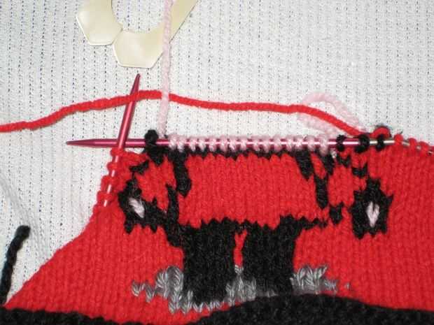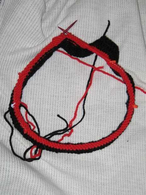Al llegar al final de la segunda fila, rompen el hilo dejando unos 6 pulgadas para tejer en más tarde. Empezar tejer con el color de fondo (rojo). Punto 3 rondas.