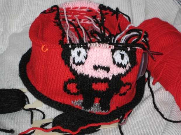 La parte fácil es sobre. Si usted apaga el sombrero de dentro hacia fuera, veremos como una cena de espaguetis explotada. Tienes un montón de trabajo tejiendo en todos los cabos sueltos y por la noche a la tensión en los puntos de sutura.