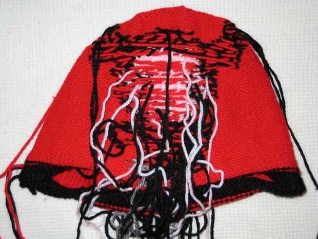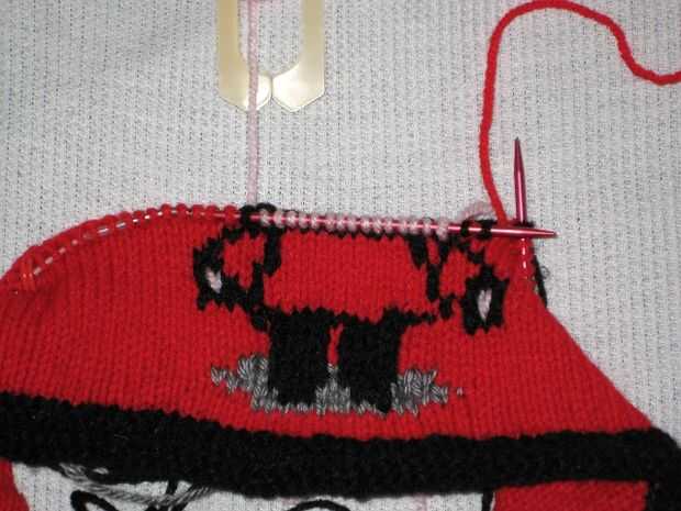 La tapa es básicamente un trozo de Fair Isle con elementos de intarsia. El rojo es trabajado como Fair Isle, cuando no se trabaja el rojo hilo es trenzado en la espalda. Cuando sea posible, toque el color de hilo están trabajando alrededor de la red de hilo cada 3-4 puntos de sutura para evitar largas hebras de hilo rojo.