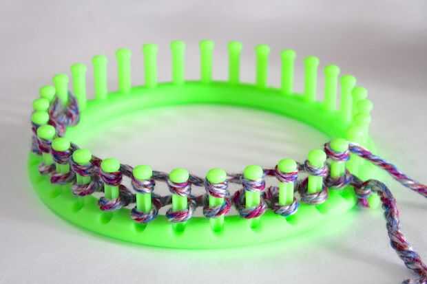 Se trata de como regular telar que hace punto, con una diferencia. Cada vez que inicie una nueva fila de tejer, te Envuelva la primera clavija de la fila por lo que el hilado va delante de la clavija, mientras que el resto de las clavijas están envueltos detrás al frente.