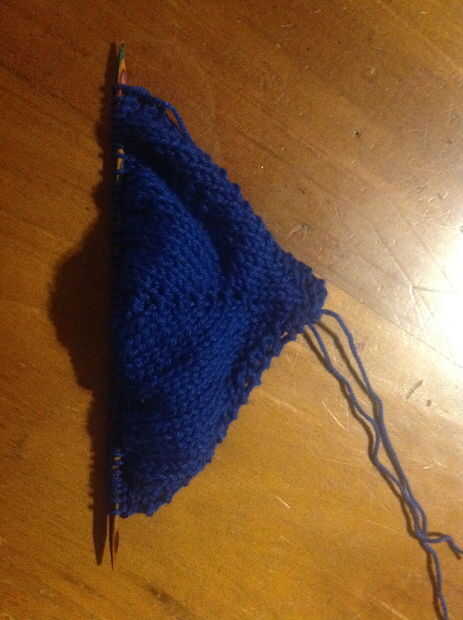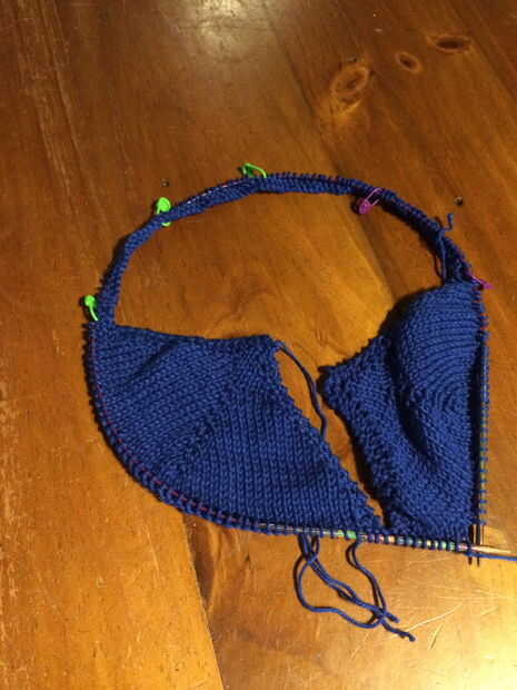 Cuando haya hecho 2 triángulos, deslícelos juntos en una aguja circular de 4mm. Fundición en 78 puntos. Esto crea el redondo de la camiseta. Coloque marcadores 1 puntada antes del último de los puntos del triángulo, en el lado de la axila, luego después de 20 puntadas, para que tenga los lados, centro atrás y marcadores para mostrar donde se crearán los ojales para las correas de la puntada.