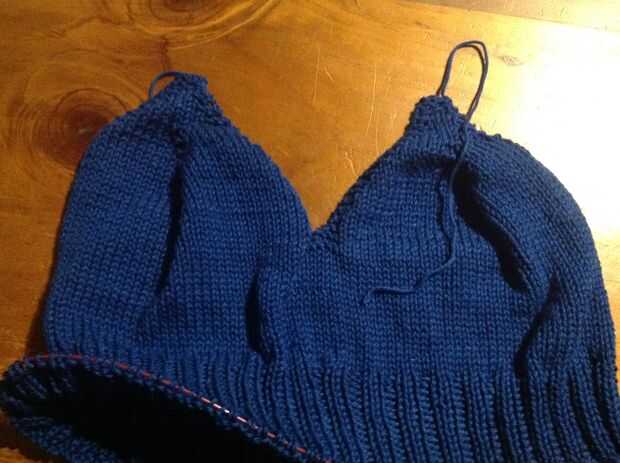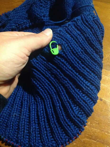 Fila 9: Costilla 20 en el K2, patrón P2, hilo, tejer 2 juntos, siguen el patrón de costilla en el segundo jalón de la puntada a lo largo (38 puntos), hilado sobre, tejer 2 juntos, continuar el patrón de la costilla hasta el marcador marcando el inicio de la sección delantera, punto al final de la rotación.
