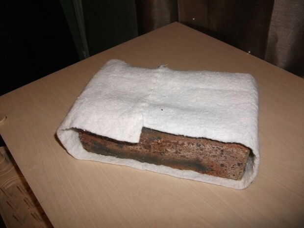 Lo envolvió en un trozo de la izquierda sobre edredón guata (de bateo) para detener el uso del ladrillo a través el tejido con el tiempo y para asegurarse de no rayan el suelo.