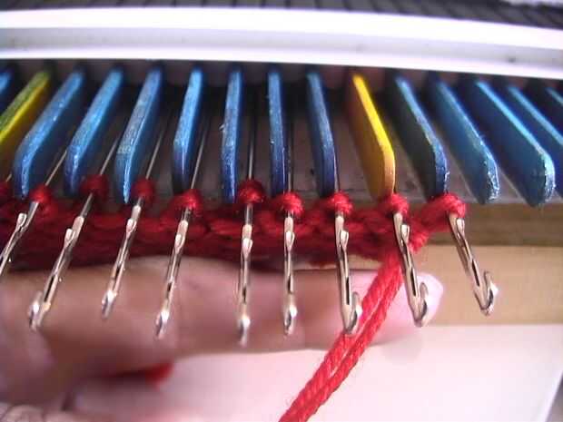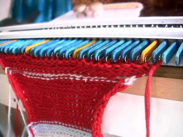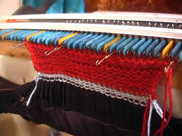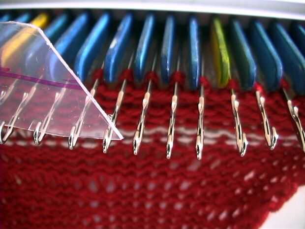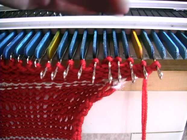 Colocar el hilo en los cierres abiertos. Para una fila de punto, empuje el carro hacia el lado opuesto dos veces. Punto de una fila! Las agujas tirón el hilo en el pestillo abierto a través de la puntada sentado detrás del pasador. Continuar con punto 35 filas. La pieza entera debe ser una forma rectangular.