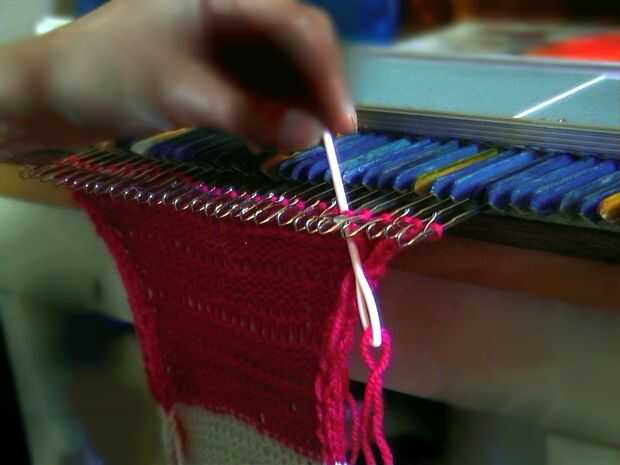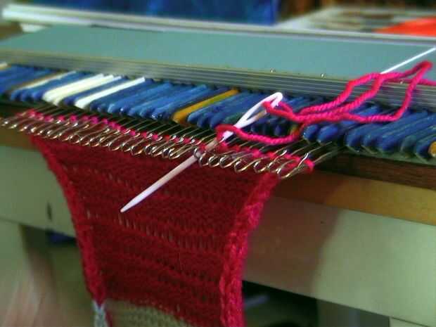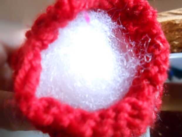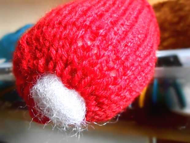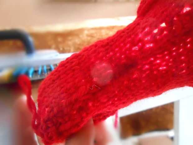 Tejer hasta tener un tipo rectangular de la forma. (Cerca de 35 filas.) Cortar una longitud cuando has llegado a la última fila. Este hilo a través de los restantes puntos de la última fila del hilo de rosca. Se reúnen bien la primera fila también. Rellenar la manzana con relleno de poliester y pin juntos la costura abierta. Coser la costura lateral con lanas o hilo con puntada invisible de Kitchner.