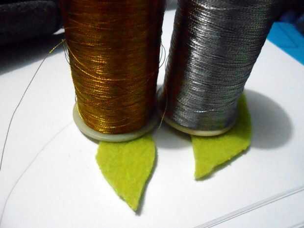 Hilo la espiga i cable por la parte superior de la manzana con la herramienta de gancho de coser aguja o pasador. Yo oro y plata hilo de coser verde hoja de fieltro.