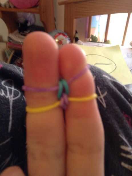 Ahora Coloque una venda encima del otro (lugar de un púrpura una encima de la amarilla) y lazo con el azul! De repetir hasta que la pulsera es hasta la muñeca!