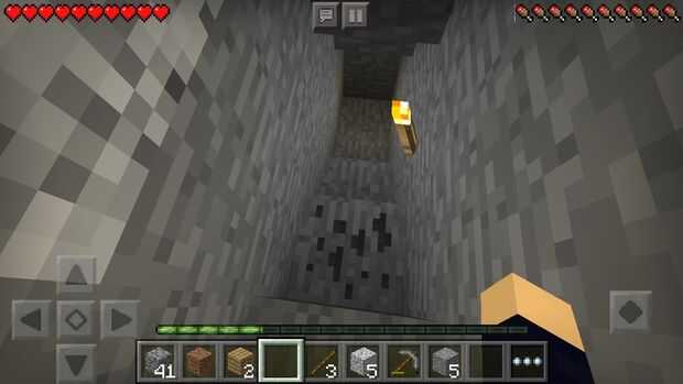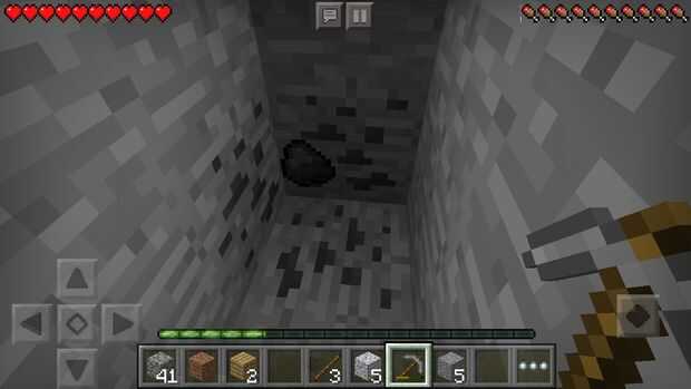 Continuar hacia abajo en forma de escalera hasta llegar a la roca de fondo, colocar antorchas periódicamente. Si golpeas el carbón, mineral de hierro, o cualquier cosa valiosa, mina hacia fuera y luego rellenar el terreno minado con adoquines. Una vez que se encuentra el mineral de hierro, subir a su casa y fundir en el horno. Volver hacia abajo, trayendo en el pico con usted.
