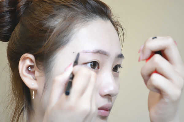 Paso 4: Dibujar la sombra de ojos. Cepille todo parpados con sombra de ojos rosa, después usar sombra de ojos marrón a lo largo del Embadurnamiento de borde, hasta paño palpebral (es decir, el área del párpado sobreponer). Finalmente utilizando la pestaña marrón para dibujar un delineador de la línea junto con las raíces de las pestañas. Se realiza el maquillaje de los ojos.
