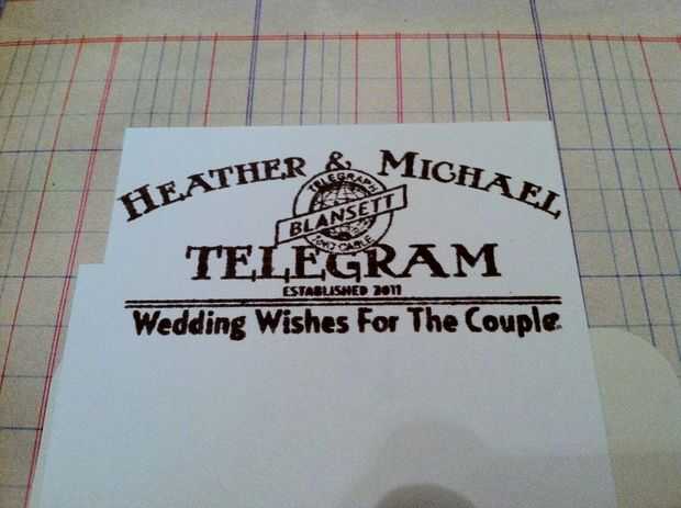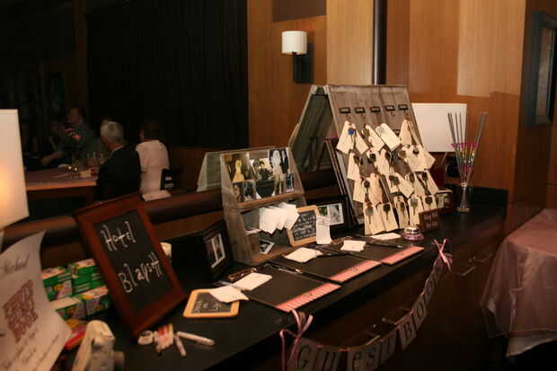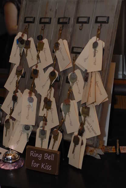 Empecé con un enfoque de cadena de montaje. Una señal para tomar su fotografía con una cámara instantánea y firmarlo. Su siguiente paso fue "muestra" donde tenía tres estaciones de firmantes. Los invitados fueron mandados a un lado donde afirma gracias a un sello de goma "signo aquí" y el otro otro sello adquirí de etsy.com como un telegrama, que nos guía a los huéspedes para escribir su boda desea. Después de que acaben su deseo de la novia, mandaron a poner la tarjeta en la ranura para enviar el telegrama. Y por último pero no menos importante, agarró a su favor de la boda lejos de tomar... una llave de hotel vintage original con etiqueta filosofía y retro bola y cadenas de celebración todos juntos en busca... una etiqueta de rubbered sellado nuevo de etsy.com que ahora tenía la clave de nuestros corazones a un lado y un sello de caucho de una vieja llave en la otra. Para finalizar su registro experiencia que podrían "timbre para el beso" en lugar de "sonar la campana para el servicio" esta muestra también fue comprada a través de etsy.com.