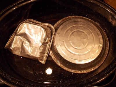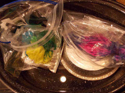 Cuidadosamente levante su bufanda (mantener la forma) y que algunos de la cerebros de exceso de tinte. Colocar en bolsa de plástico. (Bolsas separadas si estás haciendo más de uno) Ahora, coloque la vaporera (o bandejitas antiguas) en la parte inferior de la cacerola de la asación para mantener las bolsas fuera del agua. Agregue aproximadamente una pulgada de agua y colocar tus bolsas de plástico en la parte superior. Cubrir el asador. Gire a la hornilla a fuego medio y el agua comienza a hervir, una vez a la baja. Cocinar a fuego lento durante 1 hora. Echa un vistazo debajo de la tapa un par de veces para asegurarse de que no hay vapor. Esto es necesario para fijar el tinte.
