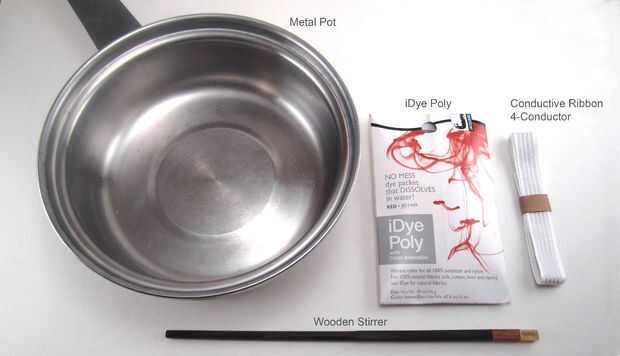 Hacer tus propios tejidos conductores, hilo, pegamento y cinta y usarlos para hacer potenciómetros, resistencias, interruptores, pantallas LED y circuitos.Utilizando pegamento conductor y el hilo conductor puede hacer circuitos y pantallas LED sobre