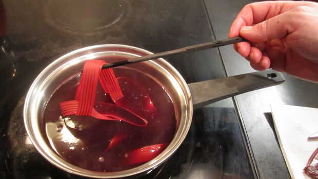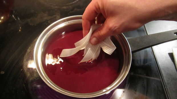 Añadir cinta previamente mojada y llevar a hervir. Mantener la temperatura y agitar con frecuencia durante 10 minutos. De color uniforme, uso constante agitación con un agitador de madera.