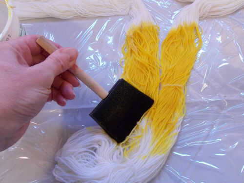 Hay muchos métodos diferentes de teñir el hilo, y me decidí a pintarlo con esponja de mi pinceles. Generalmente, utilizo botellas de squirt, pero hilado superlavables tiende a aspirar el tinte muy rápidamente y las esponjas me permiten aplicar el tinte más uniformemente un área más grande que las botellas de squirt.