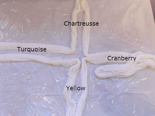 Ahora tienes que decidir cuántas rayas colores diferentes que desea y qué tan amplia debe ser cada raya. He utilizado 4 diferentes colores: turquesa, Chartreusse, arándano rojo y amarillo el sol. Mi madeja mide 14 pies y quería que el arándano rojo y turquesa rayas para ser dos veces tan ancho como el Chartreusse y amarillo sol. Dividí mi madeja como sigue: arándano rojo 56″, 56″ turquesa, 28″ de Chartreusse, sol amarillo 28″. He cubierto mi mesa con envoltura de plástico y luego había repartido mi hilo como en la imagen: