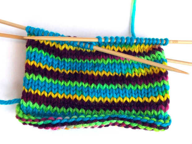 Si mi hilo había sido digitación de peso en lugar de DK, tendría más filas por color pero estoy muy contento con la forma de las rayas resultaron. Ahora, sólo tengo que empezar a tejer unos calcetines!