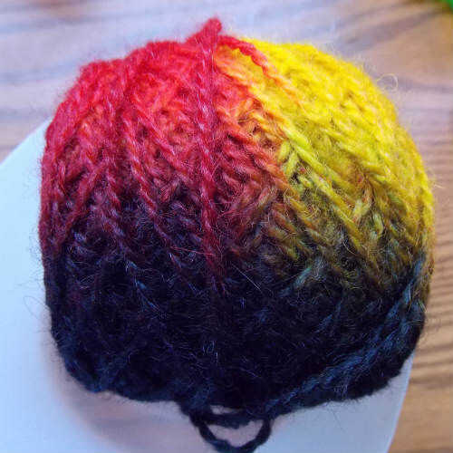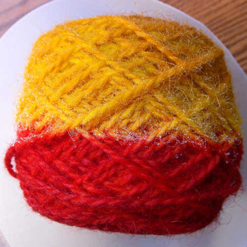 Yo había empapado mi hilo en una solución caliente de agua y vinagre durante 2 horas. A continuación, confunde mi dyestocks según las instrucciones del paquete. En primer lugar, yo la mitad de la bola de hilo con sol amarillo había teñido. En segundo lugar, me volcó el hilado y había teñido la otra mitad con cereza roja.