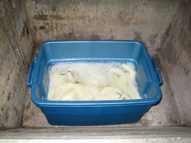 Reposar un hilo de agua caliente a la cubierta, además de 1/4 taza de vinagre y 1/4 de cucharadita Synthrapol, por lo menos 1 hora.