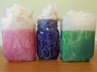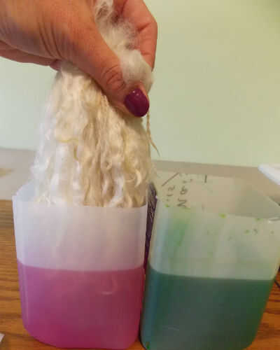 Retire con cuidado, un manojo de lana en el agua. Exprima el exceso de líquido y Coloque lentamente en el primer frasco de tinte hasta que los bloqueos son mitad sumergidos. Hacer esto con cada paquete, luego dejar reposar unos 20 minutos.