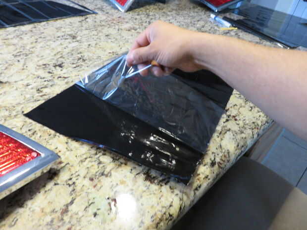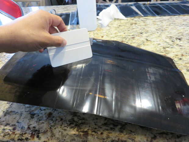 Este matiz tiene una capa protectora en la parte superior e inferior. Empezar por quitar la capa que expone el lado pegajoso. Rocíe la superficie ligera de la cola y el lado pegajoso de la tonalidad con Windex. Colocar el corte áspero en su luz y comenzar a la escobilla de goma hacia fuera el Windex con una rasqueta de plástico. Tenga cuidado de no rayar el tinte tapando la boquilla con una toalla de papel.