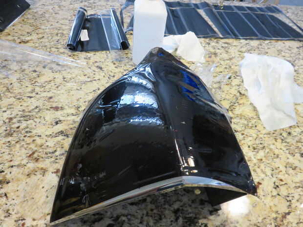 Calentar la película uniformemente en la sección que tiene más contorno. En este caso es la esquina de la luz. La película comienza plana pero va sobre una superficie curva. Como calienta el borde largo (segunda foto) Aplique presión con las manos para que estire la película en su lugar. Trabajar su camino hacia fuera a los bordes de la luz. En algunas áreas tienes que estirar la película para caber. En otros tienes que reducirlo juntos. Pero en pocas palabras se aplica mediante el calentamiento de la película, sujeta a la forma, dejándolo fresco y repetición. En la tercera foto puede ver empezando a venir.
