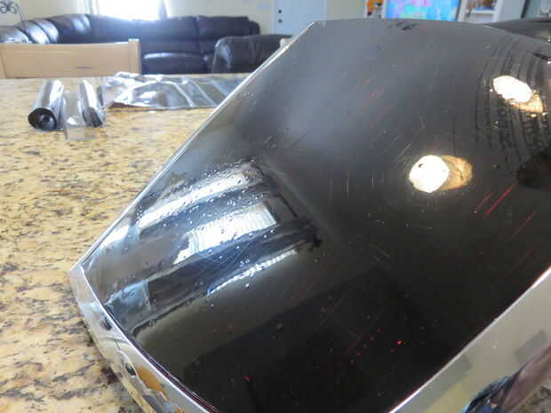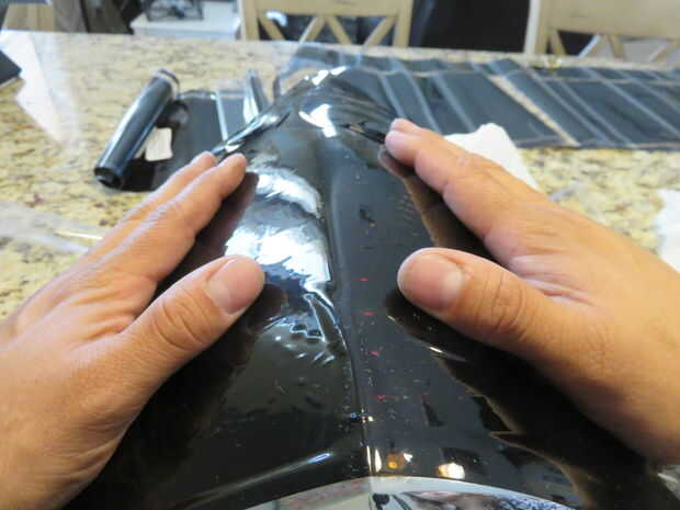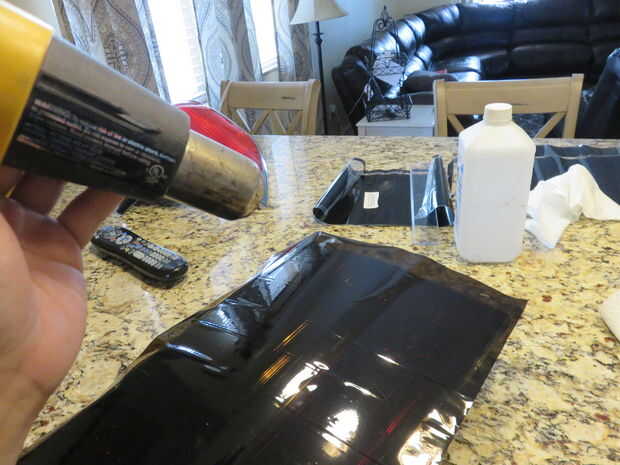 Si tienes un ayudante este es el momento de usarlos. De lo contrario tienes que hacer como yo hice y sostenga la pistola de calor con la barbilla. Esto es lo que ves en la primera foto. Tenga mucho cuidado si haces esto. Para estas luces quité la película superior inmediato. Mantenga una toalla de papel húmeda windex sobre la escobilla de goma para evitar rayaduras.