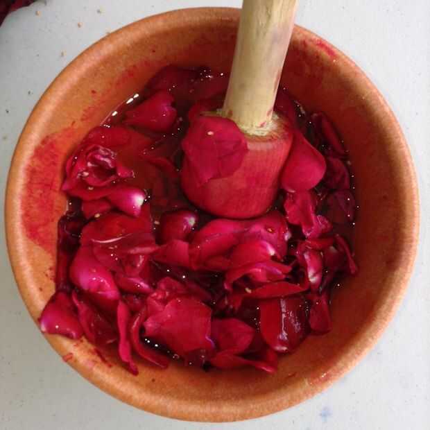 Podemos utilizar las rosas para teñir el hilo, para este paso que tenemos que machacar las rosas y poner algo de agua, entonces tienes que poner el hilo dentro del contenedor.