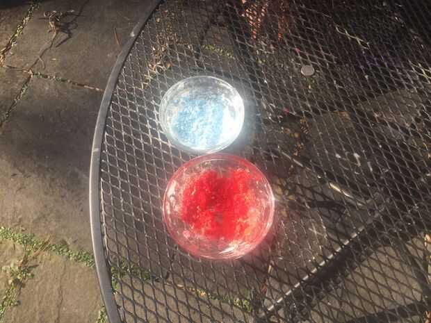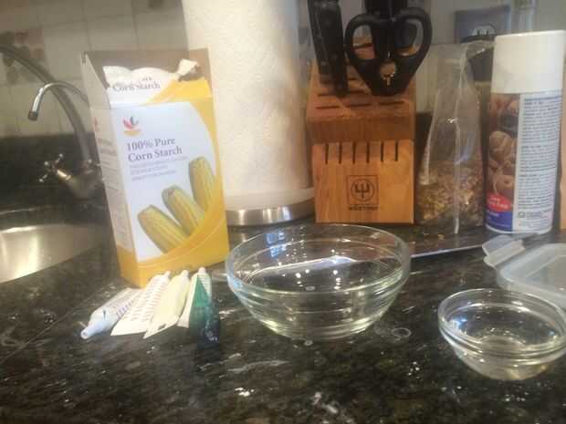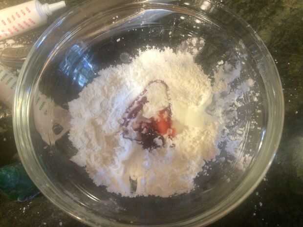 Dependiendo de cuánto colorante que desee pone un puñado o dos de harina de maíz en un recipiente, luego añadir 5-8 gotas de colorante o un poquito de gel colorante en el recipiente. Mezclar juntos hasta que quede el color que desee. Ahora podemos comenzar a teñir!