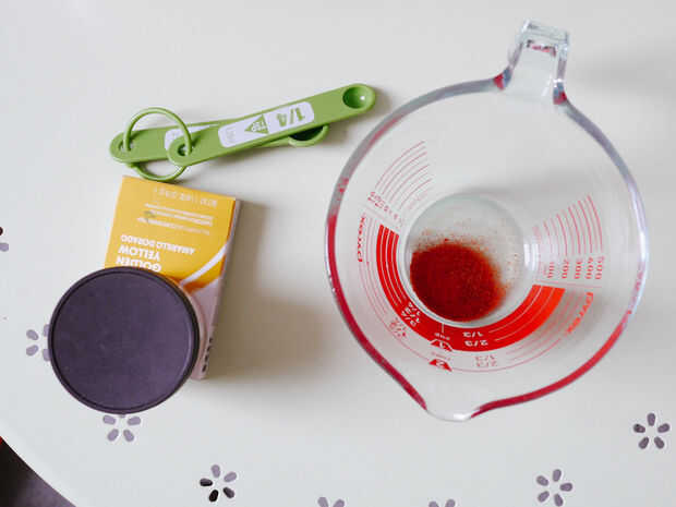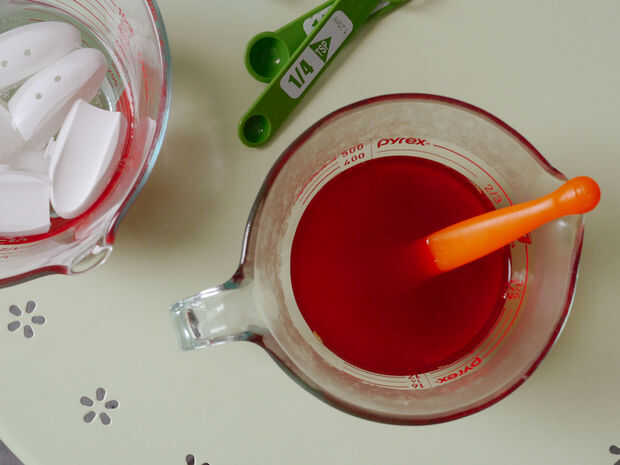 Con cuidado Mida la cantidad necesaria de colorante y agregar el agua hirviendo. Revuelve muy bien todo el polvo se disuelve en solución.