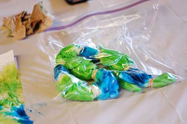 Después de que usted está satisfecho con la cantidad de tinte y el patrón que ha creado en su camiseta, colocar la camisa en una bolsa de plástico. Permite sentarse durante la noche.