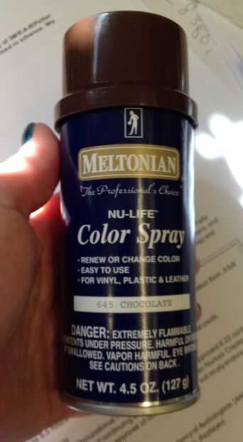 Este paso es un paso "no duh", pero a veces realmente necesario. Tengo el bolso, los guantes de látex y una lata de aerosol del Color del Nu-vida Meltonian chocolate 645. Me aseguré que la lata de leer, puesto que el tinte esta es básicamente una lata de pintura en aerosol que es conveniente para el uso con el vinilo, plástico y cuero. Las direcciones del estado muy clara para utilizar esto en un "área bien ventilada", así que decidí tomar este proyecto fuera.