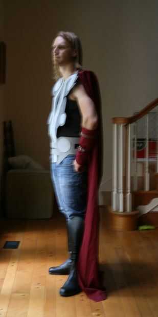 El resto del traje fue lanzado casi juntos. Más descripciones que encontré de Thor parecen tenerlo en los pantalones azules o pantalones por lo menos oscuros. Él es representado con frecuencia en una camisa negra. Así que decidí usar blue jeans y una camisa de músculo negro.
