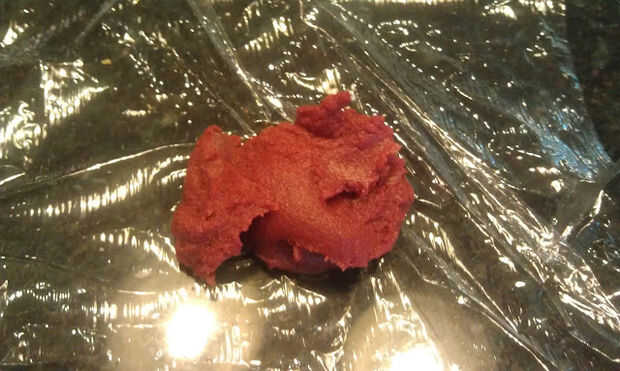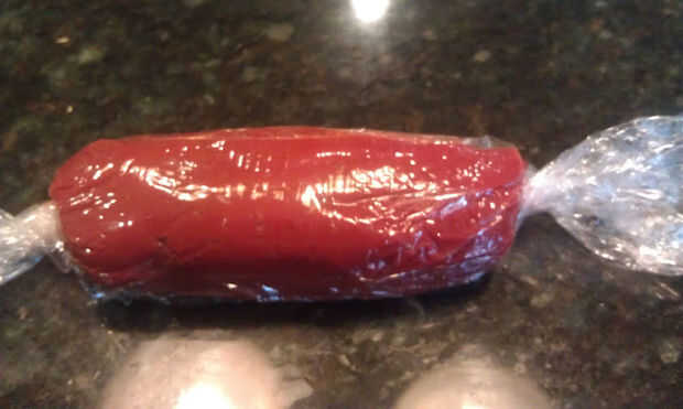 Extienda un pedazo de envoltura de plástico sobre el mostrador. Luego colocar la pasta restante en el centro de la envoltura plástica. Ahora rodar uno de los extremos de la envoltura de plástico y la forma en un cilindro. El extremo plástico del rodillo y meta bajo el cilindro. Coloque el rollo de pasta de tomate en una bolsa ziplock y guárdelo en el congelador. Próxima vez que necesite pasta de tomate, simplemente corte una ronda o dos para tu receta.