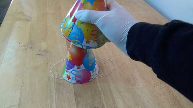 Place the booby trapped hat on the table, then put a stack of party hats on top.