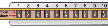 Es por ello que tocando la armónica implica una combinación de inhalaryexhalar (también llamado soplando y dibujo). Si usted sopla en el agujero 4 en una armónica de C, oirá una C. Ahora inhale –, la nota se mueve hacia arriba a un golpe de D. en el siguiente agujero es una inhalación de E., F. soplar en el agujero 6 produce un G e inhalar hace un A. ¿En este punto usted probablemente puede adivinar lo que viene después si usted sopla en el agujero 7: a B, derecho? Mal! Si usted sopla en el agujero 7, escuchará una C. Tienes que inhalar para producir el B. Como se puede ver, hay un patrón establecido para los golpes y dibuja de una armónica.