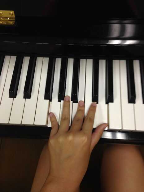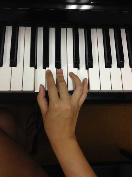 La digitación para el acorde de G mayor es el siguiente: comenzando con el meñique izquierdo en G(5), pasemos a su medio B(7) y terminar con el pulgar en D(2). Para la mano derecha comienza con el pulgar en G(5), centro de B(7) y pinky en D(2).