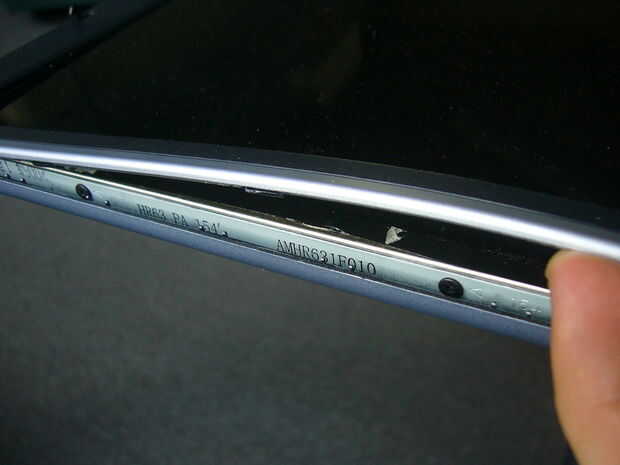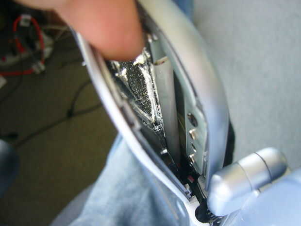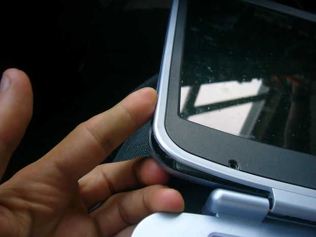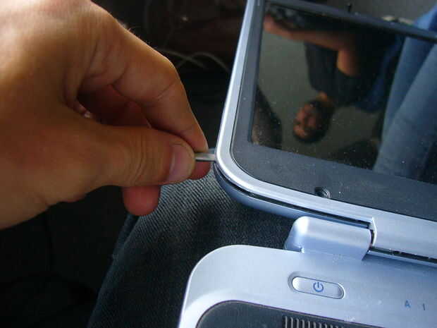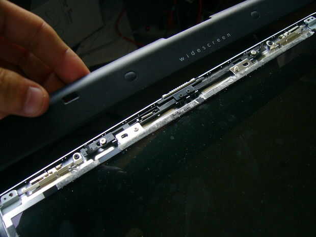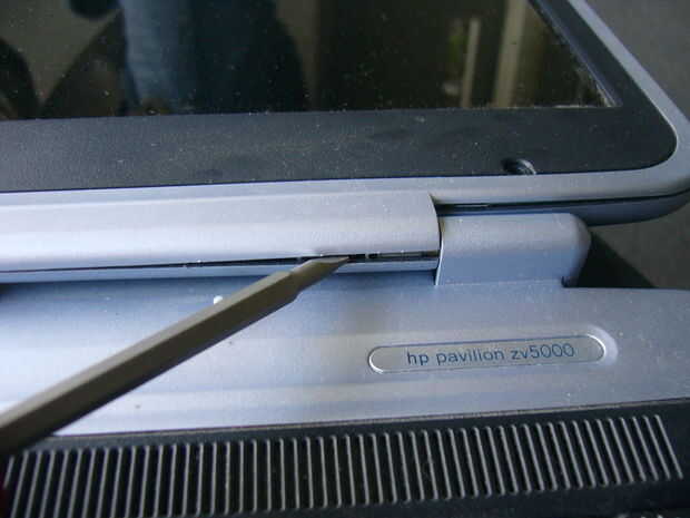 Abrir la pantalla como sea posible. Hice este paso con el portátil en mi regazo. Vistazo a la bisagra de la pantalla - la parte que se mueve. Debe haber dos secciones de 8 centímetros a la izquierda y derecha. Dentro de las sección movible, hay dos broches de presión. Estos broches se encuentran unos 2cm de los lados izquierdo y derecho de la sección móvil.