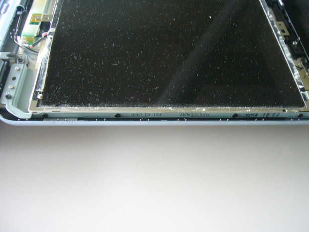 Ahora, quite los tornillos (8-4 por lado) de la abrazadera de soporte de montaje lateral (ver imagen). Para obtener su destornillador allí, pulse el bisel posterior hasta que el tornillo quede expuesto. Por esta razón retiramos los tornillos de soporte de la bisagra.