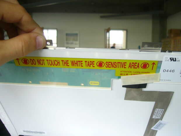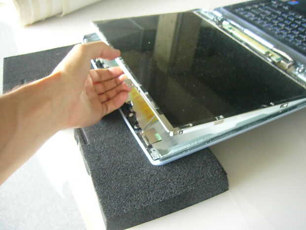 Una vez que tenga acceso a la parte posterior de la pantalla - quitar la cinta sujetando la parte inferior de la pantalla del cable. Esto le dará la libertad para girar la pantalla hacia abajo para tener acceso a su luz trasera.
