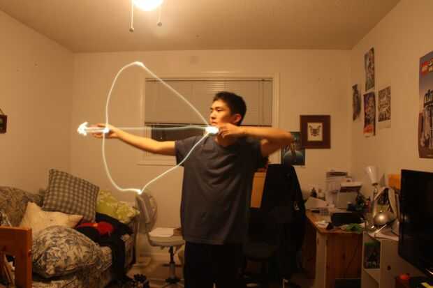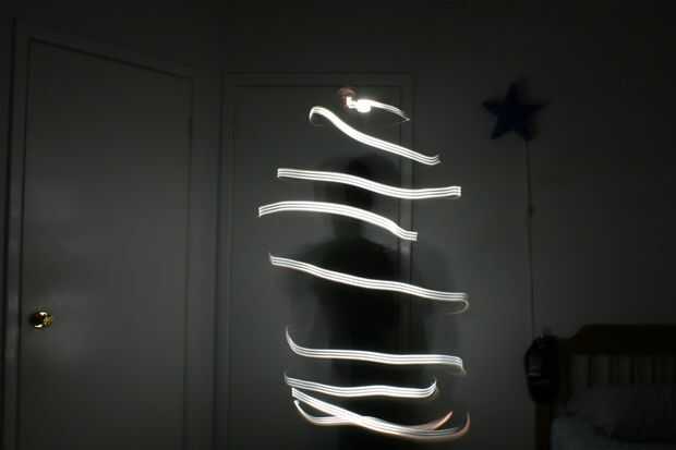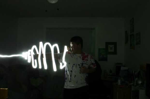 Para obtener su pintura luz ir sobre un fondo no necesita photoshop. Todo lo que tienes que hacer es dibujar usando regularmente el su fuente de luz. Cuando termines te puede utilizar flash o encender las luces en el cuarto por una fracción de segundo que su captura de cámara el entorno, incluyendo. Esto puede conducir a algunas cosas muy graciosas.